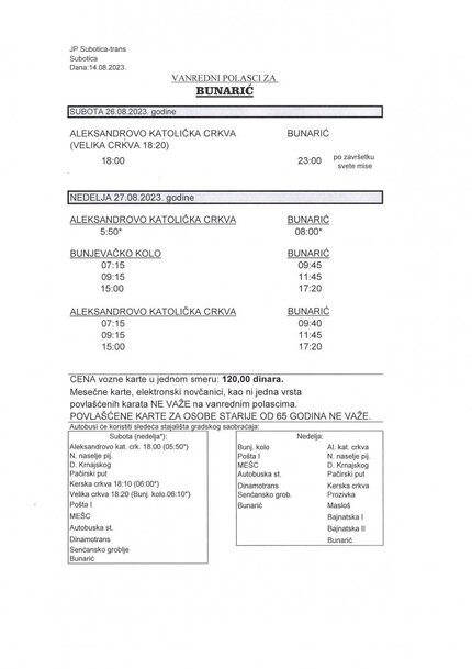 U nastavku možete pogledati raspored svetih misa na Bunariću, te raspored izvanrednih polazaka JP "Subotica-trans" do svetišta.